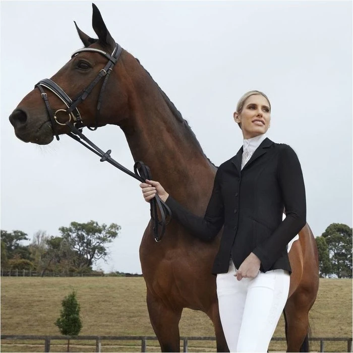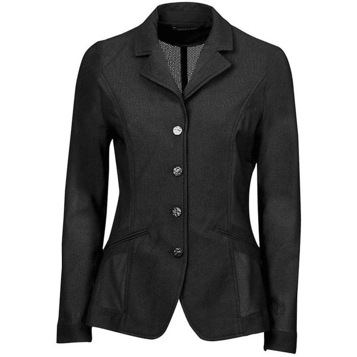 Stretch mesh competition jacket perfect for those hot summer days competitng. Flattering princess seam construction. Double vented back. Stylish button details on front & cuffs. Hidden centre zip closure. Hanger and garment bag included. 100% Nylon.