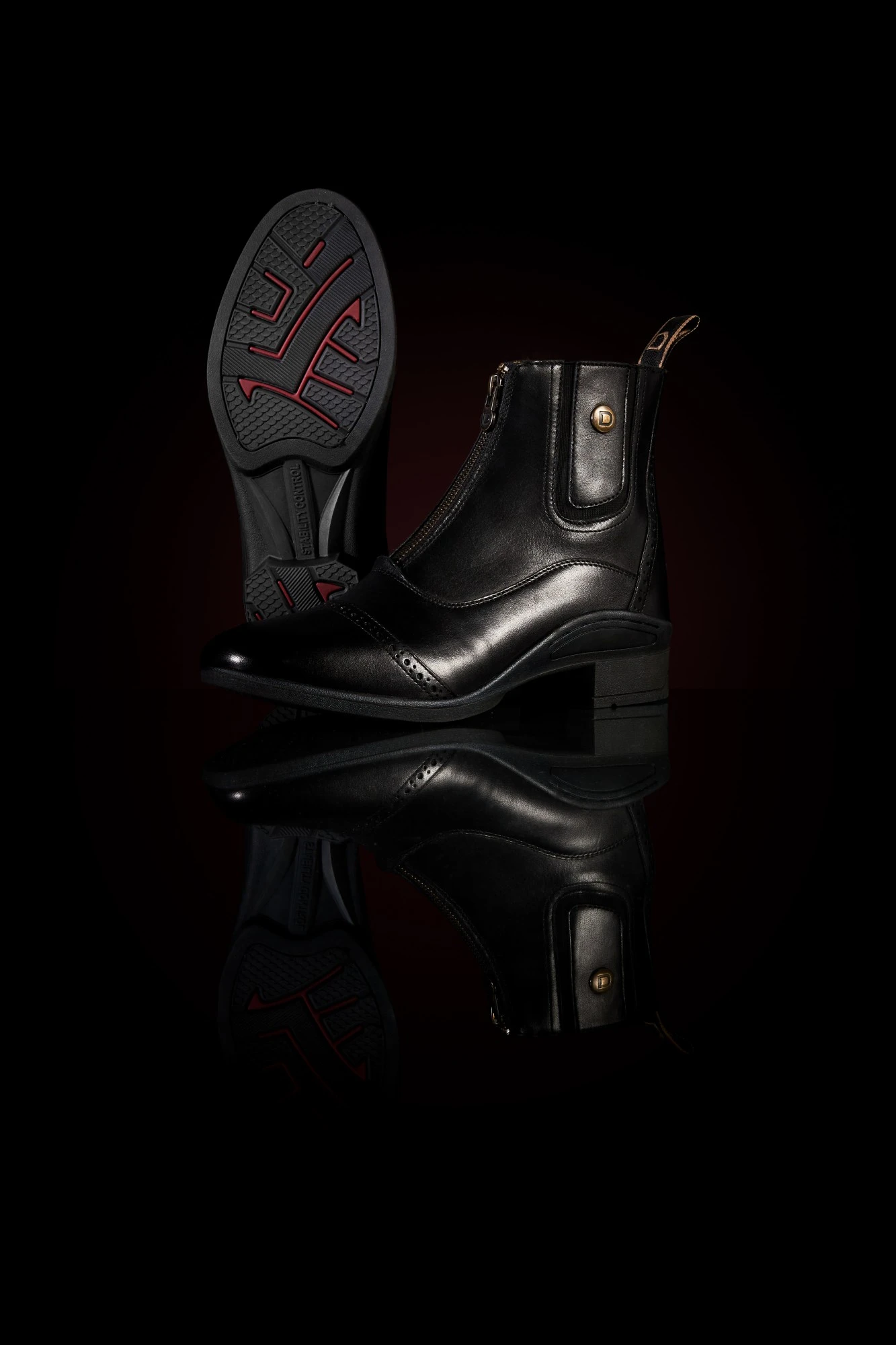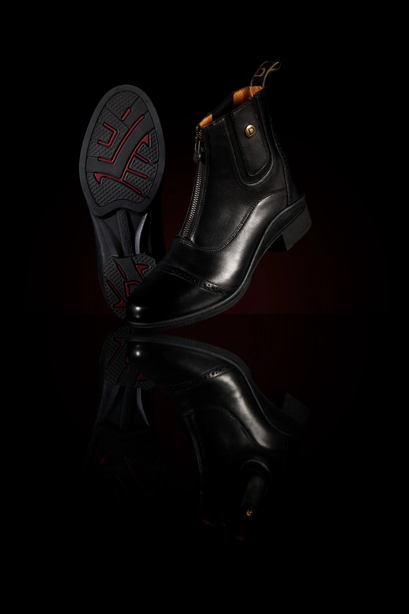 European full grain leather. Leather and breathable mesh lining. Pin punch designed heel and toe cap. Dublin branded spur rest. YKK Dublin branded quality zipper. Featuring a luxuriously comfortable RCS memory foam PU foot-bed for ultimate comfort. High arch and in-built shank designed outsole for improved lateral stability. Durable rubber outsole with flex point grooves.