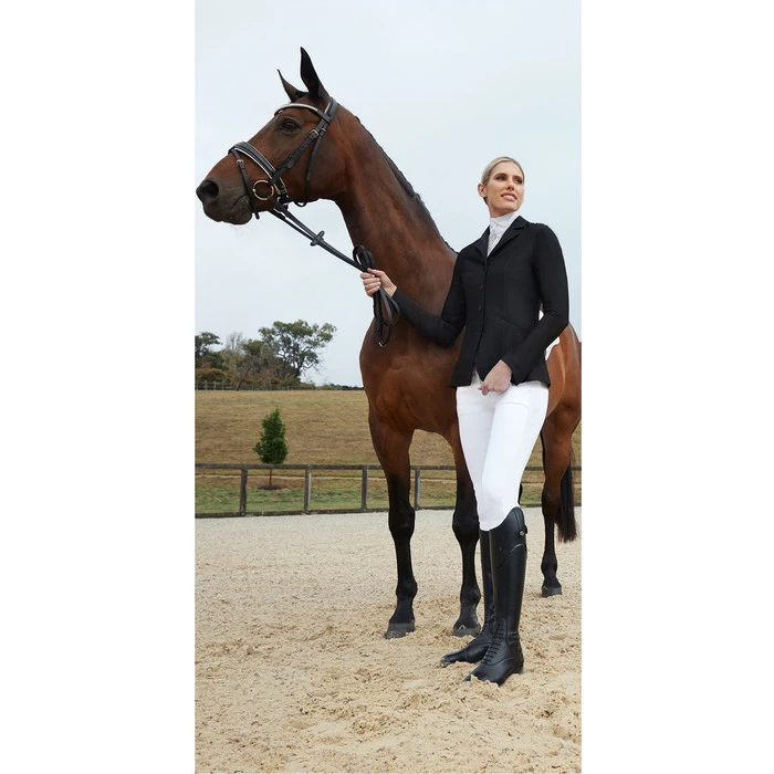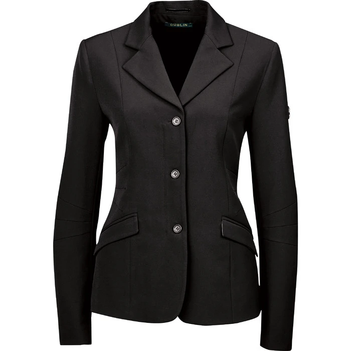 Tailored competition softshell jacket that is water repellant and breathable. Stretch fabric allows easy freedom of movement for comfort. Fully lined. Machine washable for easy maintenance. Stylish button detail on front & cuffs. Hidden centre zip closure. Hanger and garment bag included. 96% Polyester / 4% Spandex.